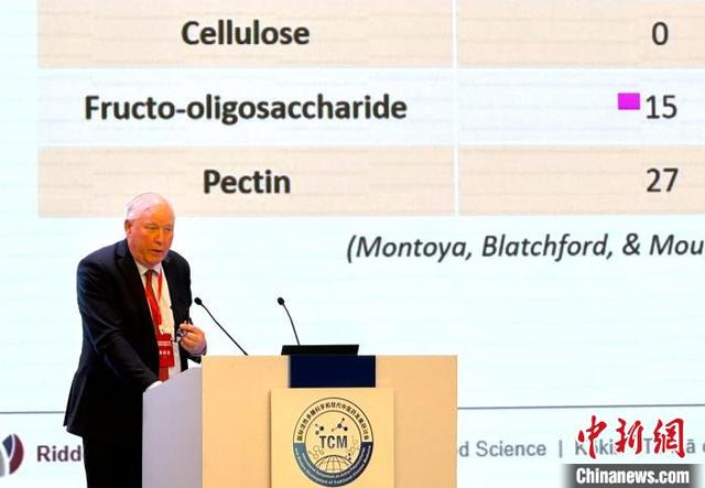 新西蘭梅西大學Riddet研究院院長、教授Paul Moughan(保羅·莫根)作題為“非淀粉多糖的健康效益”的主旨報告。吳允杰攝