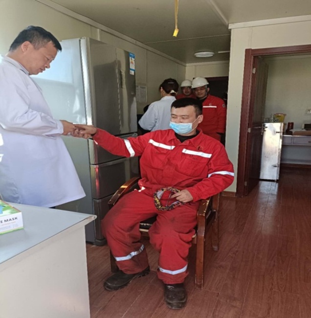 除了服務當地百姓,援科醫療隊還為在科中資企業和華人華僑提供健康咨詢及義診幫助,為企業中外員工提供健康咨詢并開展義診活動,就廣大員工關心的健康問題開展保健講座、健康問答,有的員工正在被頸椎病、腰椎間盤突出癥、慢性腰肌勞損、偏頭痛等病癥困擾,醫生們當場為他們針灸、拔罐治療,治療以后大家都對中醫的治療效果高度認可。