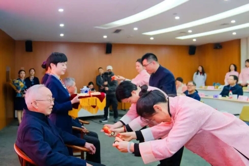 當天,隨著上海市名中醫吳煥淦工作室、上海市名中醫蔡定芳工作室、上海市名中醫徐振曄工作室、上海市名中醫陸金根工作室揭牌,各工作室弟子代表分別向老師們行拜師禮、敬拜師帖、奉拜師茶、獻拜師花。醫務處主任金珠向吳煥淦教授拜師,神經內科主任王楓向蔡定芳教授拜師,全科主任蓋云、副主任楊曉萍向徐振曄教授拜師,肛腸科主任陳步強、醫師馬星向陸金根教授拜師。