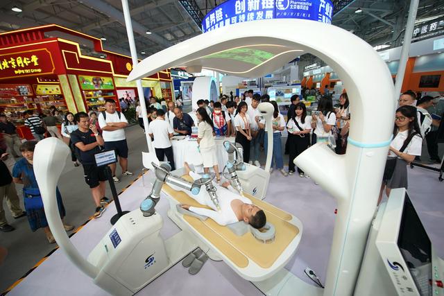 在2023年中國國際服務貿易交易會上參觀者在觀看數字中醫循經治療機器人展示