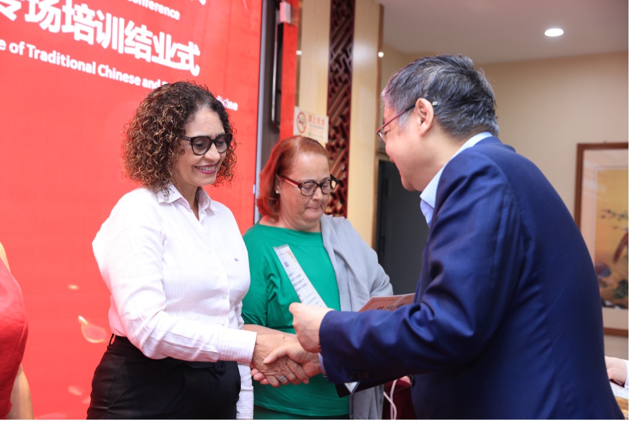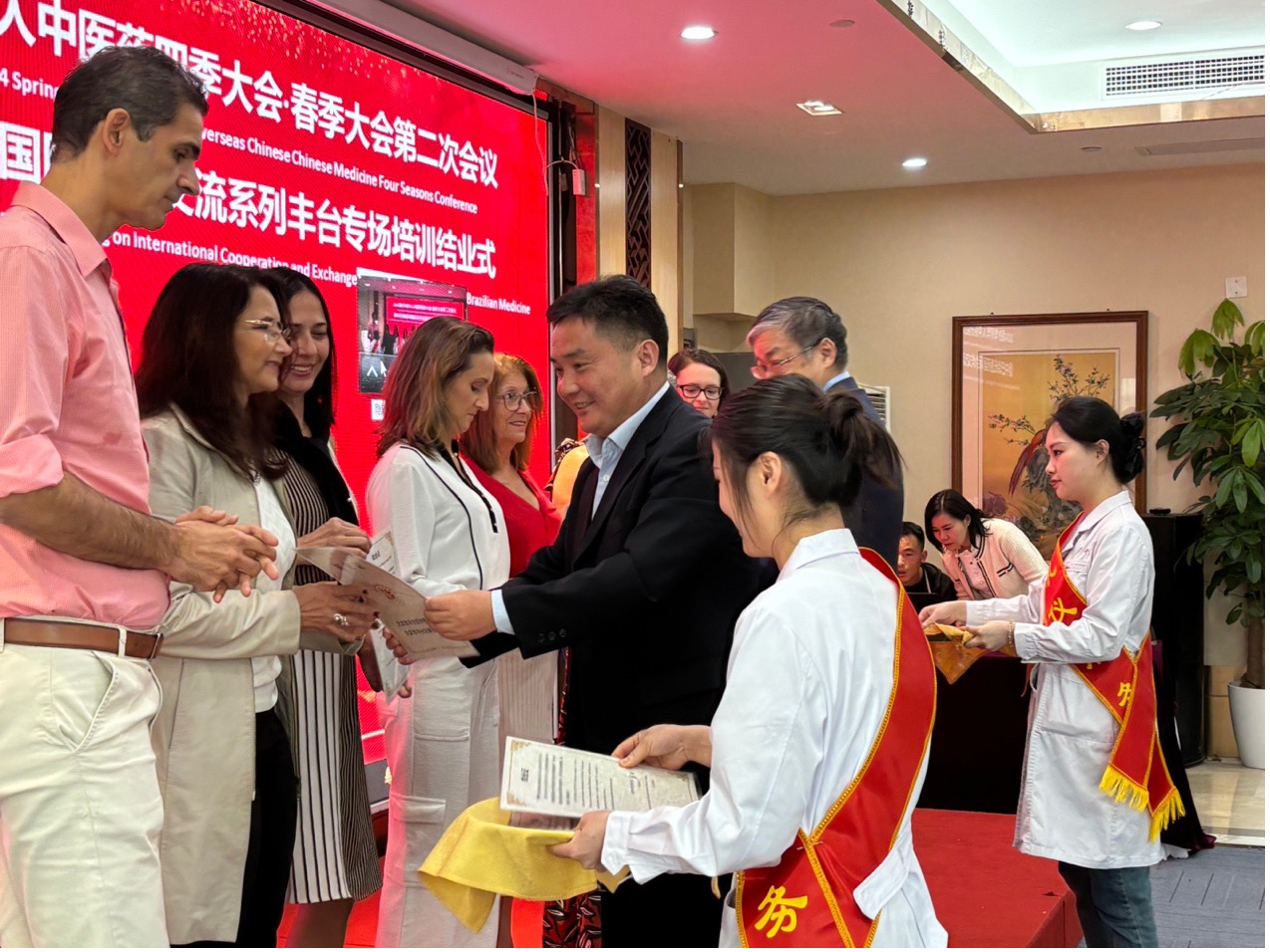 北京市中醫管理局局長屠志濤 北京市豐臺區區委衛生健康工委書記、豐臺區衛生健康委主任牛倉林為巴西學員們頒發結業證書