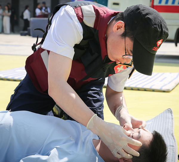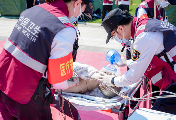 本次演練中,江西隊集結九江、南昌、贛州、萍鄉、景德鎮五市區骨干隊員參演,負責“檢傷分類”環節,醫生迅速評估傷情并匯報,協助做出施救的判斷;陜西隊處理右側胸骨塌陷的傷者,給予氣管插管、呼吸機輔助通氣;河南隊救援人員給脊柱損傷的傷員佩戴頸托;重慶隊則是以小夾板技術快速處理了下肢脛腓骨中段骨折的傷員。