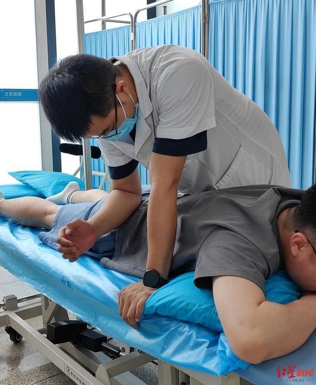 5月22日,黨先生第二次來到成都市第一人民醫院康復醫學科。技師先是為他進行了約10分鐘的推拿按摩,然后是懸吊。記者看到,黨先生在技師的指導下,將雙腿懸吊在牽引帶上,然后做出多種訓練動作,不一會兒,汗珠就浸透了黨先生的衣服。黨先生說,每次完成推拿和訓練之后,他感覺腰椎沒有那么緊繃,會放松許多。