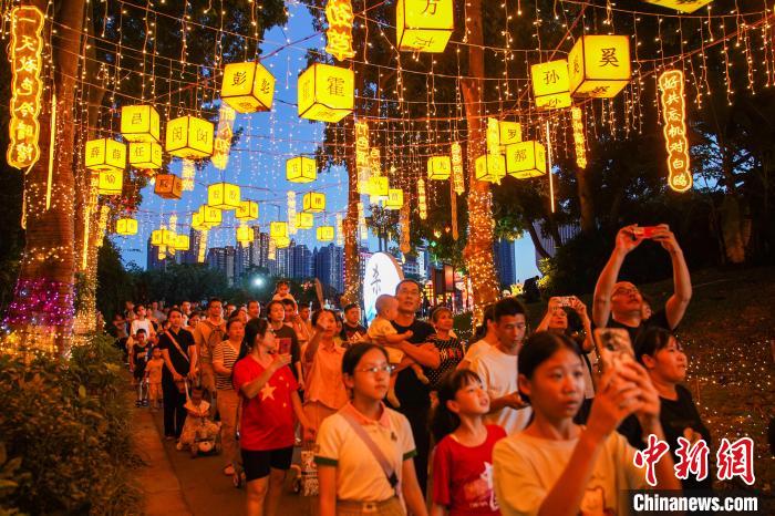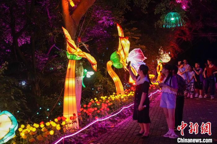 8月3日晚,廣西南寧,不少市民游客來到廣西藥用植物園觀賞中醫藥文化燈展?!八幱弥参飯@·光影奇妙夜”暨廣西藥用植物園第二屆中醫藥文化燈展近日在廣西藥用植物園舉行,游客可在奇幻光影間觀賞李時珍著書劇、非遺打鐵花、煙花瀑布等表演,感受中醫藥文化的浪漫。