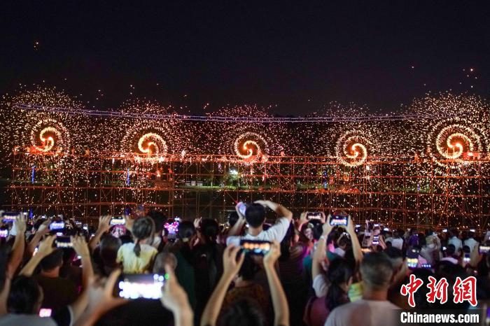 圖為現場上演打鐵花表演時游客紛紛舉起手機