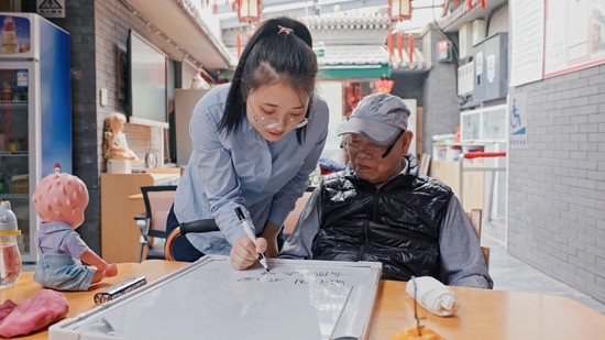 北京市東城區東四街道匯晨老年公寓 游波與一名老人用白板寫字交流