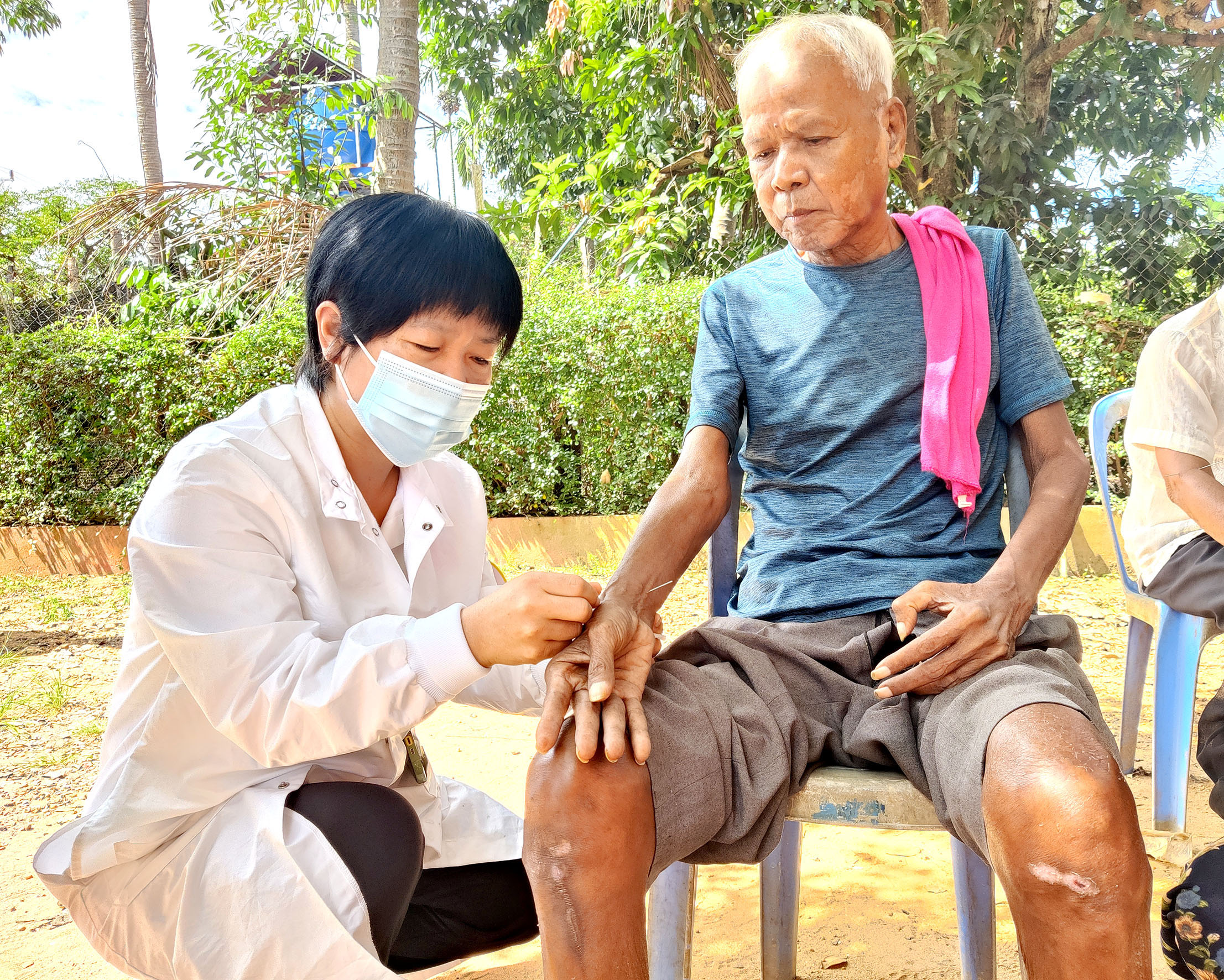2023年11月4日,王淑麗在柬埔寨阿克諾達小學為當地患者做針灸治療。受訪者供圖