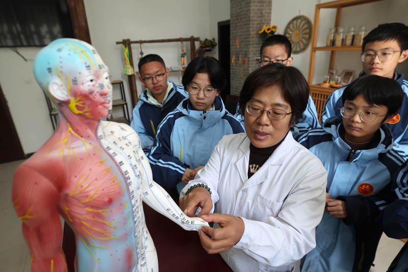 10月22日,在河北省石家莊市第十中學中醫課堂,中醫老師為學生們講解人體穴位及按摩功效。