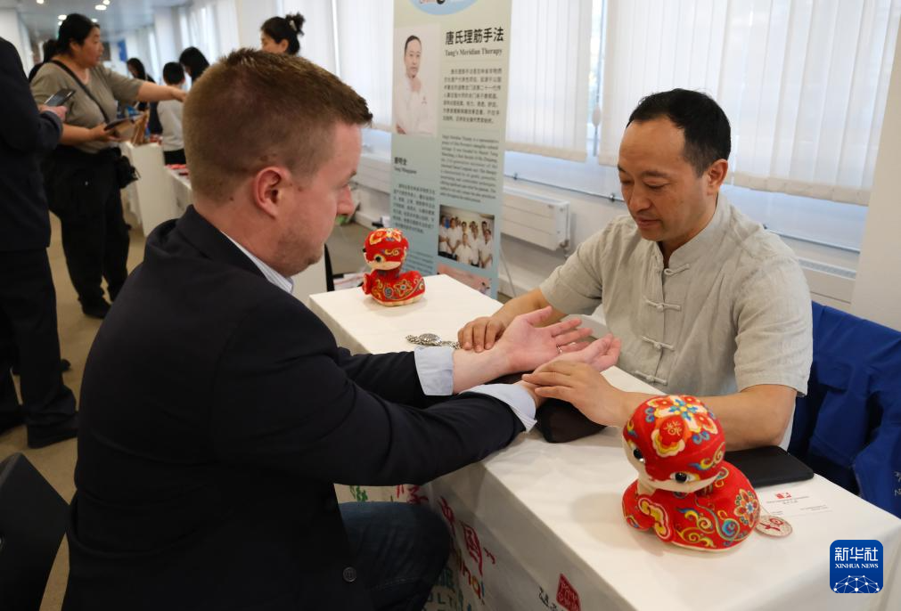4月4日,嘉賓在瑞士伯爾尼中國文化中心舉行的“你好!中國”吉林省文旅推介會上體驗中醫把脈。新華社記者馬汝軒攝