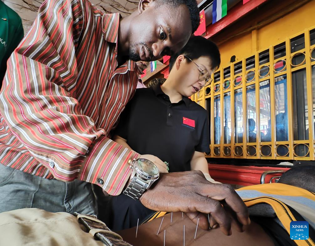 A trainee (L) takes hands-on acupuncture practice under the guidance of an expert from the Chinese medical team during a training course on traditional Chinese medicine (TCM) techniques in Freetown, Sierra Leone, June 27, 2025. The 26th batch of the Chinese medical team to Sierra Leone held a training course on traditional Chinese medicine (TCM) techniques in Freetown, the capital of the western African country, from Thursday to Friday.(The 26th batch of the Chinese medical team to Sierra Leone/Handout via Xinhua)