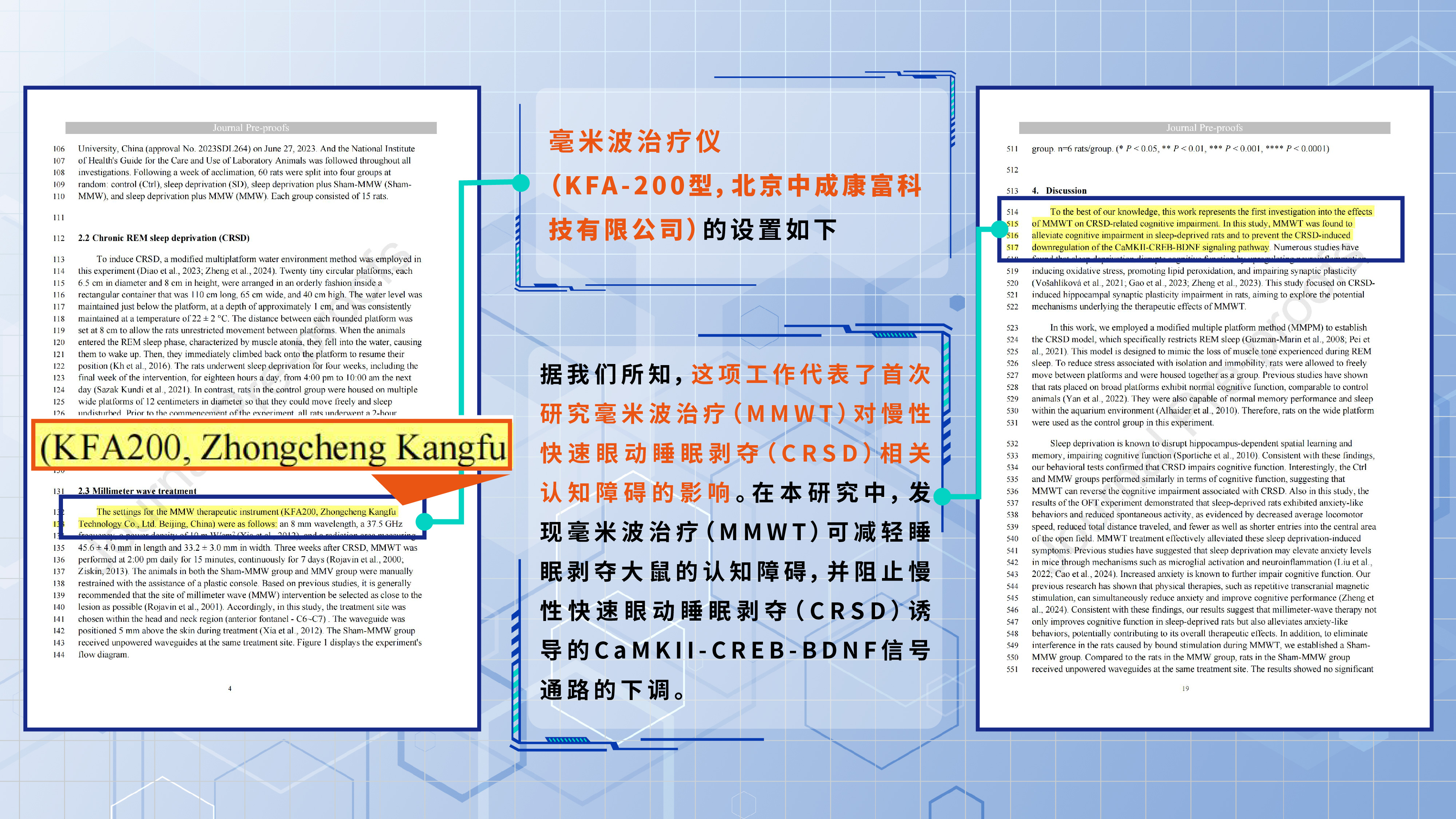 實驗中,研究團隊采用中成康富科技股份有限公司百全毫米波治療儀KFA-200型,首次研究“毫米波治療對慢性快速眼動睡眠剝奪相關認知障礙的影響”。