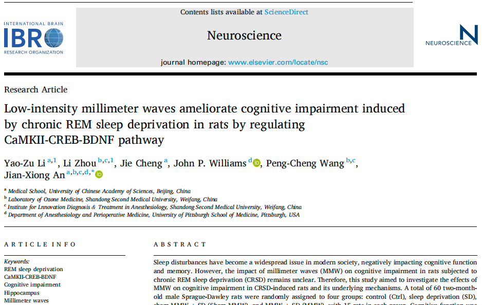 慢性失眠正在危害人類健康,睡眠研究因此也成為大國科技競爭領域。令人失望的是,全球睡眠醫學專家的共識是,除外認知行為療法(CBT-I)外,包括藥物和物理療法等諸多均不列入推薦方法。為探尋更好的治療手段,安建雄團隊與美國匹茲堡大學合作,率先開展毫米波干預睡眠剝奪大鼠療效研究,發現低強度毫米波(MMW)可有效緩解慢性快動眼睡眠剝奪(CRSD)所致認知障礙,并證實其機制與調節海馬突觸可塑性有關。研究成果于2025年7月發表于國際權威英文期刊“Neuroscience(神經科學)”雜志。中國科學院大學博士研究生李耀祖與山東第二醫科大學碩士研究生周莉并列第一作者,通訊作者為安建雄教授。該研究受到國家重點研發計劃項目和國家自然科學基金資助。